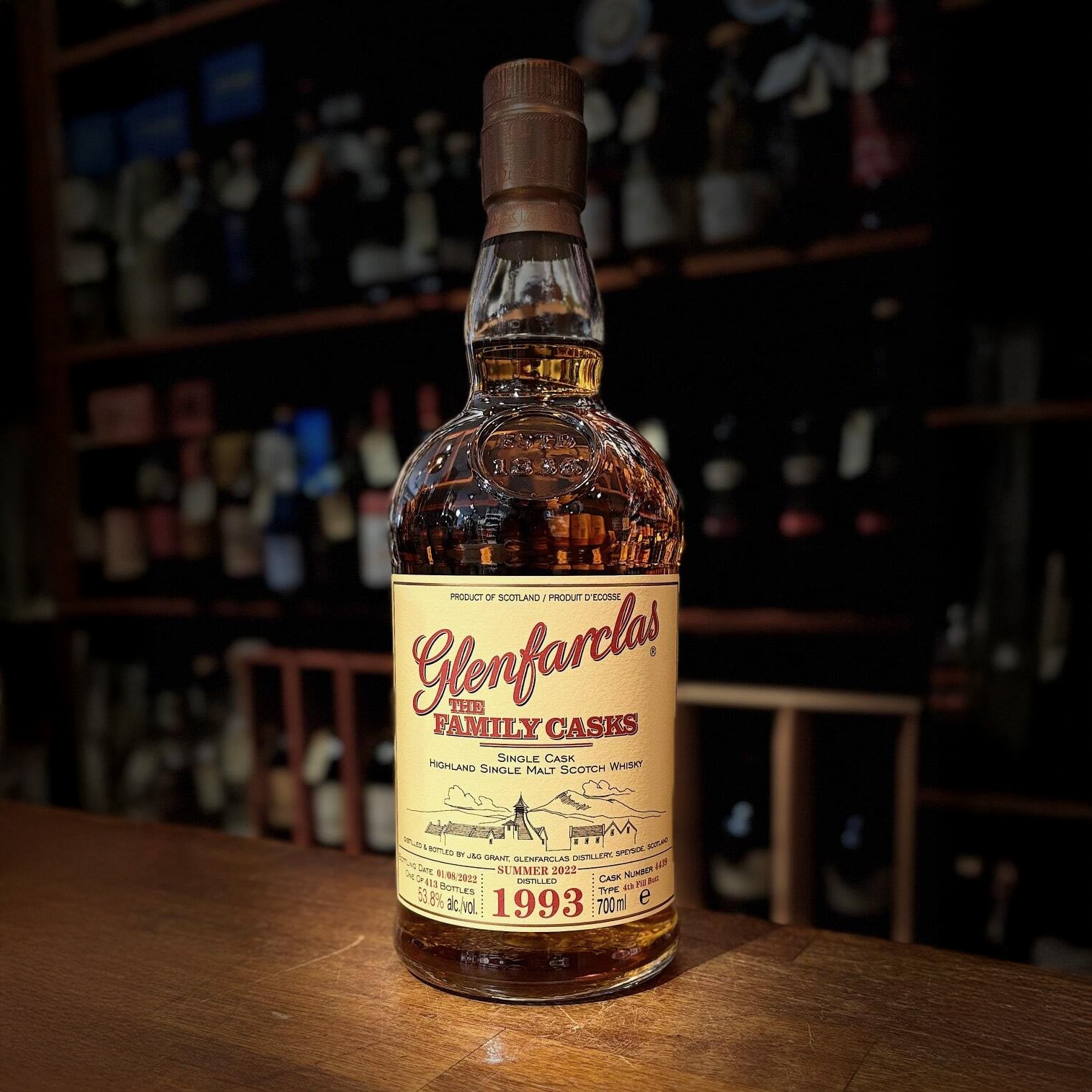 Glenfarclas Family Casks 1993 #4439 er ikke bare en flaske whisky – det er et stykke skotsk historie, tappet direkte fra hjertet af Speyside. Denne eksklusive single cask whisky er destilleret i 1993 og tappet den 1. august 2022, hvilket gør den til en 29 år gammel skat for samlere og kendere. Kun 413 flasker findes på verdensplan fra Cask #4439, et 4th Fill Butt, hvilket giver whiskyen en elegant modenhed med finesse og karakter. Denne udgave er tappet ved cask strength på 53,8%, hvilket betyder uforfalsket intensitet og autenticitet – præcis som naturen skabte den.